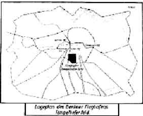 Am 29. August 1909 überflog, aus Friedrichshafen kommend und von einer Unmenge Zuschauern bestaunt, das »Zeppelin«-Luftschiff LZ 6 das Tempelhofer Feld; bald darauf führten die Gebrüder Wright aus den Vereinigten Staaten die ersten Motorflüge in Deutschland vor. Berlin erhielt in Johannisthal Ende September 1909 seinen ersten Flugplatz. (BM 2/93, S. 48) 1915 folgte der Flugplatz Staaken. Tempelhof kam wegen Militärnutzung noch nicht in Betracht. Auch gehörte das in Frage kommende Gelände nicht der Stadt. Vom Kriegsministerium wurden für Flugveranstaltungen Ausnahmegenehmigungen erteilt. Aber der Ruf nach einem Zentralflughafen, günstiger gelegen als die Flugplätze Johannisthal im Osten (etwa 14 Kilometer vom Stadtzentrum entfernt) und Staaken im Westen (18 Kilometer zum Stadtinneren), wurde, insbesondere vom Reichsverkehrs- und vom Reichspostministerium, immer nachdrücklicher erhoben. Vor allem der Verkehrsdezernent der Stadt, Stadtbaurat Leonhard Adler, setzte sich da- | |||||