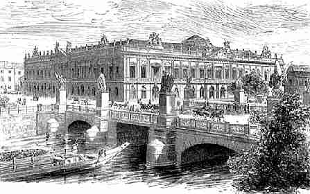 Geländer erheblich beschädigt. Die Skulpturen waren während des Krieges abgenommen worden und tauchten 1945 in Berlin-West wieder auf. 1960 war die Brücke, seit dem 13. April 1951 in »Marx- Engels- Brücke« umbenannt, wieder hergestellt. 1981/82 kehrten die weltberühmten Figuren nach Berlin-Ost zurück, wurden gründlich restauriert und 1983/84 auf neu errichteten Marmorpostamenten an ihren historischen Standorten wieder aufgestellt. Schließlich erhielt »die schönste Brücke der Hauptstadt« am 2. Oktober 1991 auch ihren alten Namen zurück – eine kleine Erinnerung an einen einst großartigen Stadtraum.