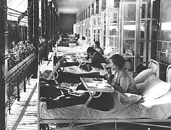 2. Unterbringung und Behandlung der ansteckend Kranken in Krankenanstalten; 3. Einrichtung von Fürsorgestellen zur sozialen Unterstützung der Tuberkulose kranken und ihrer Familien; 4. Aufklärung über die Ansteckungsgefahr durch Tuberkulose; 5. Verbesserung ungünstiger Wohnverhält nisse durch staatliche Stellen. Als wichtigsten Faktor zur Verhinderung der Weiterverbreitung der tuberkulösen Infektion sah Koch die Isolierung der Schwerkranken an, weil diese beim Husten meist massenhaft Tuberkelbakterien ausscheiden und unter den ungünstigen Wohnbedingungen ihre Familien ansteckten. Die Behandlung in den damaligen Krankenanstalten galt nur der Stärkung der Abwehrkräfte der meist hinfälligen Kranken. Neben den Krankenanstalten für Offentuberkulöse wurden schon 1860 erste Heilstätten oder Sanatorien für Lungenkranke eingerichtet, wo Frühformen der Tuberkulose, die oft noch keine Tuberkelbakterien ausschieden, geheilt werden sollten. Diese Sanatorien wurden in klimatisch günstigen Lagen der Mittelgebirge eingerichtet. Die Behandlung dort schloß Wasseranwendungen, Freiluftliegekur und Atemgymnastik neben der eiweißreichen Ernährung ein. Daneben wurden auch Lebertran, Gold- und Kupferpräparate als spezifische Therapie verabreicht. |