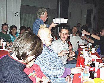 Da wurden die Helfer plötzlich nachdenklich Zum Abschluß der Show sangen alle den Song, der auch eine Fußballhymne geworden ist, »Nur nach Hause geh'n wir nicht !« Da wurden sie plötzlich nachdenklich - vor allem die (sagen wir es ruhig) tapferen Helferlein. Aber bei aller Spekulation, das bißchen gesunden Mutterwitz, das man braucht, um die Liedzeile auf die eigene Kappe zu nehmen, hat sich hier jeder erhalten. |