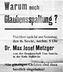 war geschlossen und die Publikationen seines Verlages waren verboten worden, die Christkönigsgesellschaft in Meitingen wurde durchsucht, deren Räume besetzt und Veranstaltungen gestört worden - unternahm er Anfang der 40er Jahre eine Vortragsreise durch 17 deutsche Städte, in denen sich dann ökumenische Gesprächskreise bildeten. Allerdings wurde ihm auch von verschiedenen Ordinariaten Redeverbot erteilt, so auch in Berlin. In der Haft 1939, Metzger war eine Beteiligung am Hitler-Attentat im Münchener Bürgerbräukeller nachgesagt worden, verfaßte er einen Brief an Papst Pius XII., der als sein ökumenisches Vermächtnis gelten muß. In Vorwegnahme des II. Vatikanischen Konzils unter Johannes XXIII. forderte er ein Reformkonzil mit einer vorbereitenden Konferenz mit zwölf Theologen aus den durch die Glaubensspaltung betroffenen Ländern. Voraussetzung dazu wäre die Überprüfung geltender Dogmen und der Verzicht auf Selbstgerechtigkeit und Überheblichkeit seitens der katholischen Kirche.