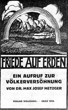 Durch die Erlebnisse als Militärseelsorger im Krieg geprägt, verschrieb sich Metzger von nun an verstärkt dem unbedingten Einsatz für eine friedliche Welt, wie sein Friedensprogramm in zwölf Punkten an Papst Benedikt XV. im Frühjahr 1917 und seine diversen Friedensappelle beweisen; im 1916 in Graz von Metzger gegründeten Volksheil-Verlag (heute Kyrios-Verlag GmbH Meitingen/ Freising) veröffentlichte er 1918 die Broschüre »Friede auf Erden. Ein Aufruf zur Völkerverständigung«, die Vorschläge für einen dauerhaften Frieden zum Inhalt hatte. Mit der Gründung des »Weltfriedensbundes vom Weißen Kreuz« 1917 (ab 1920 »Weißes Kreuz, Katholische Innere Mission«) bekam seine Friedensinitiative eine Plattform, die er im Laufe der nächsten Jahre auch für die Ökumene- Arbeit nutzte. |