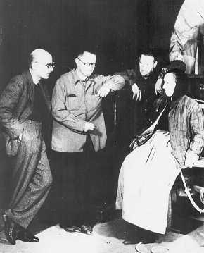 Das Berliner Ensemble noch ohne eigene Spielstätte; bei der Probe im Deutschen Theater Engel, Brecht, Dessau und die Weigel (v. l. n. r.) | |