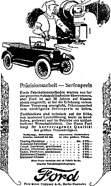 In dieser Zeit entschloss sich der amerikanische Industrielle Henry Ford (1863-1947), ausgerechnet in Berlin Automobile zu bauen. In ganz Deutschland waren damals knapp 426000 Kraftfahrzeuge unterwegs. Jährlich produzierten etwa 200 einheimische Hersteller ungefähr 39000 Gefährte, |