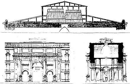 Schlossportal III (Eosander- Portal) von 1845; oben: vergrößerte Nachzeichnung des Dachaufbaus ohne konstruktive Details (der dritte Behälter ist verdeckt), Aufriss, rechts: Schnitt mit den drei Wasserbehältern im Dachaufbau von 1719/20 | ||
