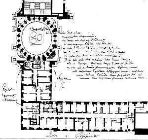 Die handschriftlichen Eintragungen von Nicolai (Original=rot) in den »Grundriss des III. Stockwerkes (= 4. Geschoss)« vom Berliner Schloss | Diese Beschreibung ist nur zum Teil richtig. Das Wasserreservoir bestand nicht nur aus einem Bassin, sondern aus mehreren. Die Aussage über den Standort der Wasser- Hebemaschine ist absolut falsch. Außerdem war nicht Böhme der geistige Vater, sondern, wie in mehreren Geschichtswerken richtiger dargestellt, der Maler Johann Sigismund Ebert. Hier stutzt man zunächst - ein Maler als Schöpfer einer Ingenieuranlage? Zur Erläuterung: Es gab in jener Zeit die Berufsbezeichnung »Maler, Grottierer und Sprützenmacher«, manchmal auch »Fontainist« oder »Fontainieur« bzw. »Fontänenmeister« oder »Grottenmeister« genannt. | |||