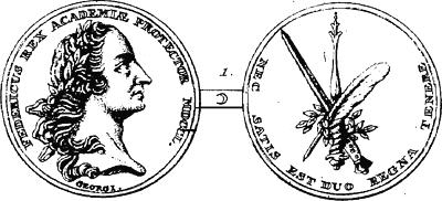 Friedrich II. als Protektor der Akademie auf einer Medaille (von Nils Georgi, Kupferstich aus »Das neu eröfnete Münzcabinet« von 1761) | ||