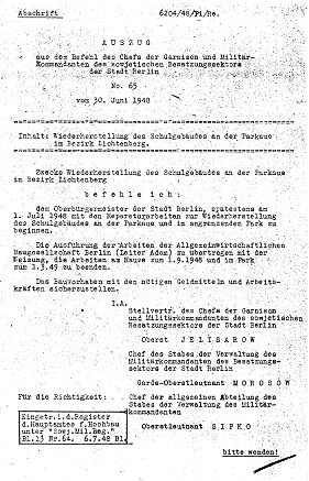 Befehl der sowjetischen Verwaltungs- Chefs zum Wiederaufbau der Gebäude 1948 |