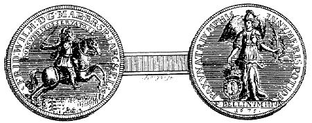 Fehrbelliner Siegestaler von 1675 mit reitendem Herrscher und stehender Pax, die das kurbrandenburgische Zepterwappen hält | ||