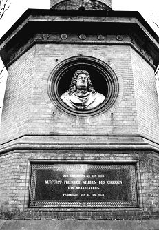 Der Große Kurfürst schaut von der Siegessäule bei Hakenberg im Land Brandenburg auf die Besucher herab Gemälden, aber auch auf Münzen und Medaillen gefeiert, man kann auch sagen ausgeschlachtet worden. |