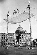 20. Mai Im Stadion Lichtenberg findet das erste Fußballspiel seit Kriegsende statt. 21. Mai Die erste Nummer der »Berliner Zeitung erscheint. 27. Mai Als erstes Theater nach dem Kriege öffnet das Renaissance- Theater mit dem Schwank »Der Raub der Sabinerinnen«. 1. Juni Aufgrund eines Befehl des Stadtkommandanten nehmen das Stadtgericht und die Amtsgerichte ihre Tätigkeit auf. In der grünen Dienstuniform von vor 1933 tritt die neue Polizei in Erscheinung. Das Kabarett der Komiker wird im Leon- Saal am Lehniner Platz wieder eröffnet. | ||