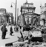 26. Juni Die Christlich- Demokratische Union Deutschlands (CDU) tritt mit einem Gründungsaufruf hervor. 30. Juni Die Deutsche Staatsoper, deren Haus Unter den Linden zerstört ist, wird im Deutschen Theater feierlich wiedereröffnet. Ihre künftige Heimstatt wird der Admiralspalast am Bahnhof Friedrichstraße sein. 1. Juli Aufgrund einer Vereinbarung vom Vortag treffen die ersten Kontingente der US- Truppen in Berlin ein. Es folgen in den nächsten Tagen britische und im August französische Verbände. Der vom Krieg schwer in Mitleidenschaft gezogene Zoologische Gartens wird wiedereröffnet. Zu den verbliebenen rund 100 Tieren zählen ein Elefant, ein Schimpanse, ein Flußpferd, ein Braunbär und ein Damhirsch. Auf der Rennbahn Karlshorst wird das erste Berliner Nachkriegs- Traberrennen durchgeführt. | |||