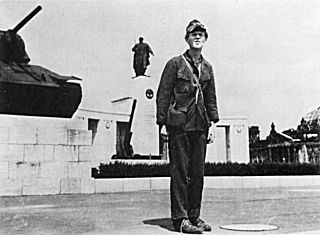 Szenenfoto aus dem Film »Berliner Ballade«, Hauptdarsteller Gert Fröbe vor dem neuen sowjetischen Ehrenmal in Tiergarten | ||||