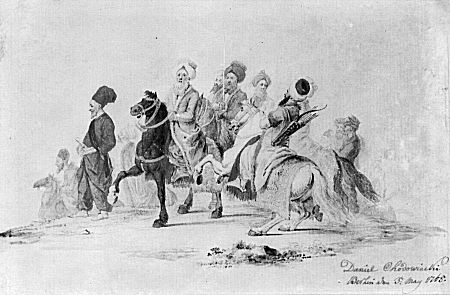 Der türkische Gesandte Achmet Effendi mit seinem Gefolge in Berlin. Tuschzeichnung von Daniel Chodowiecki, 3. Mai 1765 | ||