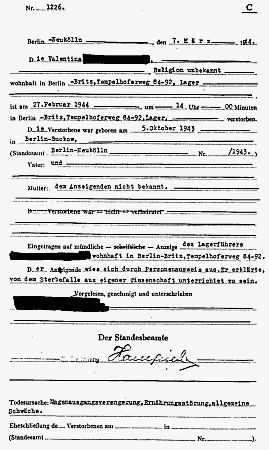 1944 und 1945 sind hier mindestens 17 Kinder von »Ostarbeiterinnen« geboren. Gelegentlich waren die Mütter mit ihren Ehemännern zusammen im Lager interniert. Die Verwaltung des Lagers scheint ihre Besonderheiten zu haben: Im Juni 1944 wurden alleine elf Geburten aus dem gesamten vergangenen Jahr gemeldet. Ausdrücklich ist dabei vermerkt, daß die Meldung durch die Werkschwester »mit Genehmigung der unteren Verwaltungsbehörde« erfolgte - eine Notiz, die ich sonst in Büchern aus Standesämtern nicht gesehen habe und die mir bisher unerklärlich ist. Wenige Tage vor Kriegsende wurden wiederum sechs Geburten gemeldet; alle lagen maximal vier Wochen zurück. Dies lässt den Schluss zu, dass wahrscheinlich in anderen Monaten ähnlich viele Kinder zur Welt kamen, die aus welchen Gründen auch immer dem Standesamt nicht gemeldet wurden. Vielleicht blieben die Informationen bei ebendiesen unteren Verwaltungsbehörden liegen. Die Zahl der Tempelhofer Zwangsarbeiterkinder dürfte demnach wohl noch wesentlich höher liegen.