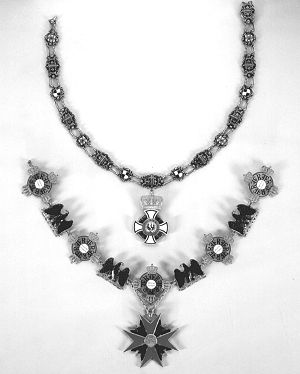 Königlicher Hausorden von Hohenzollern, Kollane mit Kreuz der Großkomture; Preußen 1866 Unten: Hoher Orden vom Schwarzen Adler, Kollane mit Ordenszeichen; Preußen 1864 |