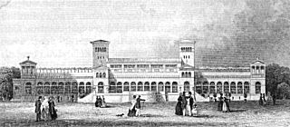 Das Kroll'sche Etablissement, erbaut von L. Persius und E. Knoblauch; Stahlstich von 1850 | darunter viele höhere Militär- und Zivilbeamte, und auch Prinzen der königlichen Familie treffen an der Unglücksstelle ein, die alsbald von Garde- Ulanen, einer Abteilung Infanterie und Schutzmännern abgesperrt wird. Mit den zahlreichen Löschapparaten, die binnen kürzester Zeit um das Gebäude aufgestellt werden, sind nur die Nebengebäude zu retten. | |||