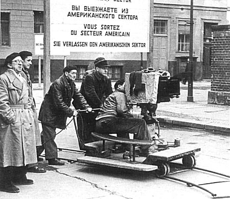 In »Hauptmann von Köln« (1956) greift Slatan Dudow (1903-1963) neonazistische Umtriebe in der Bundesrepublik auf. Zum aktuellen »Halbstarken«- Problem drehen Gerhard Klein (1920-1970) und Wolfgang Kohlhaase (geb. 1931) den inzwischen zum DEFA- Klassiker gewordenen Streifen »Berlin - Ecke Schönhauser« (1956). Annekathrin Bürger (geb. 1937) spielt ihre erste Hauptrolle, und Ekkehard Schall (geb. 1930) gibt, deutlich vom Vorbild James Dean beeinflusst, den männlichen Part. Es geht um die Probleme von Jugendlichen, die auf die schiefe Bahn gerieten. In dieser Zeit entstehen aber auch heiter besinnliche Filme wie »Der Kahn der fröhlichen Leute« (1950), »Eine Berliner Romanze« (1956), »Vergeßt mir meine Traudl nicht« (1957) mit Eva-Maria Hagen (geb. 1934) und »Verwirrung der Liebe« (1959) mit Annekathrin Bürger und Angelika Domröse (geb. 1941). Neue Produktionsstätten in Haselhorst Während die DEFA das Filmgelände in Babelsberg bei Berlin nutzt, steht für die Westberliner Produktionen zunächst nur das Filmstudio in Tempelhof zur Verfügung. |