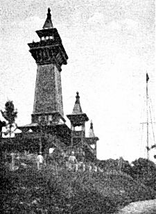 Um 1930: der alte und ... Vom Turm selbst blieben nur glühende Balkenreste übrig. Als Brandursache stellten sich Schweißarbeiten im Inneren des seit fast einem Jahr wegen Baufälligkeit gesperrten Turmes heraus. Die Handwerker hatten kurz vor Ausbruch des Feuers Feierabend gemacht. Die von der HO Köpenick initiierte Renovierung sollte dem 69 Jahre alten Turm neuen Halt geben. Auch war geplant, bis zum 1. Mai 1959 auf der oberen Terrasse neben dem Turm ein modernes Restaurant einzurichten. |