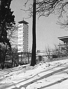 ... der neue Müggelturm um 1961 Müggelturm, ein verglaster Stahlbetonbau von neun Stockwerken mit einer über 126 Stufen zu erreichenden Aussichtsplattform, wurde nach 26- monatiger Bauzeit mit der Silvesterfeier 1961 im neuen Turmrestaurant eröffnet. Repros: LBV |