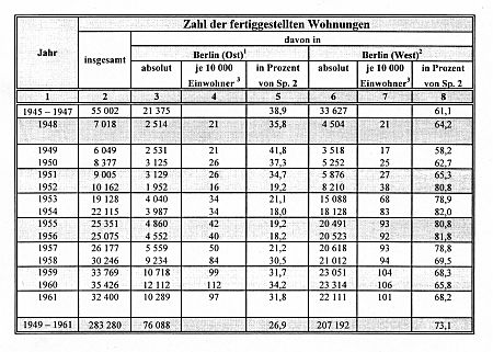 Das Wohnungsdefizit als Differenz zwischen der Zahl aller Haushalte und der Zahl der vorhandenen (Normal-) Wohnungen konnte in West-Berlin von 326 000 (1950) auf 186 000 (1961) gesenkt werden, also um 140 000 Wohnungen oder 43 Prozent des Ausgangsdefizits - und dies bei einer Zunahme von fast 60 000 Haushalten. In Ost-Berlin verringerte sich das Defizit, begünstigt durch rückläufige Bevölkerungs- und Haushaltszahlen, sogar von ca. 150 000 (1950) auf ca. 50 000 Wohnungen im Jahr 1964, also in einer drei Jahre längeren Zeitspanne um ca. 100 000 Wohnungen oder etwa 67 Prozent des ursprünglichen Defizits.