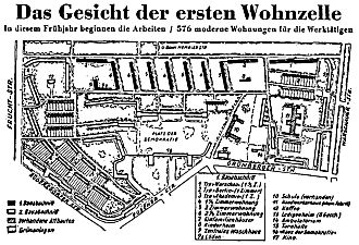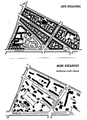 Auch die Otto-Suhr- Siedlung, von 1956-1961 in der ehemaligen Luisenstadt im Bezirk Kreuzberg direkt an der Grenze errichtet, sollte mit ihren über 1 200 neuen Wohnungen die Absicht des Senats demonstrieren, zu den Menschen in Ost-Berlin »hin« zu bauen. Ferner wurden die ersten baulichen Sanierungsbemühungen im Mietskasernenbezirk Wedding damit begründet, dass die dortigen Wohnungsmissstände »Gefahren für den sozialen Frieden« darstellten, »insbesondere im Blickwinkel des aggressiven Bolschewismus in Berlin«.11) Auch in Ost-Berlin lagen einige Wohnungsbau- Standorte, wie zum