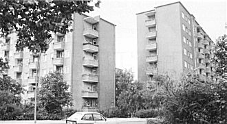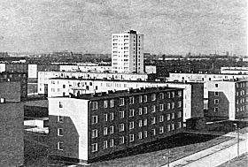Vom Platz und Raum gestaltenden Städtebau in der nationalarchitektonischen Phase ging man seit Ende der fünfziger Jahre wieder zur Zeilenbauweise über. Dies brachten die bautechnisch sehr unflexiblen Montagebauweisen mit sich, wie sie überhaupt starre städtebauliche Gestaltungen im Gefolge hatten: »Der für die Montage der Fertigteilelemente entwickelte Turmdrehkran >Baumeister< konnte ebenso wenig die Montage von Ecksektionen wie die Montage rechtwinklig zueinander stehender