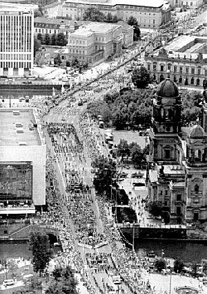 Ende 1987 lebte laut statistischer Fortschreibung in Gesamt-Berlin eine Wohnbevölkerung von 3 289 637 Personen, davon 61,7 Prozent (2 028 716) in West- und 38,3 Prozent (1 260 912) in Ost-Berlin. 1961 lautete das Verhältnis 67,6 Prozent zu 32,4 Prozent. Die Einwohnerdichte Berlins lag 1987 bei 36,8 (1961: 37,8) Ew./ha, dabei in West-Berlin bei 42,3 (1961: 45,7) Ew./ha und in Ost-Berlin nur bei 31,3 (1961: 26,2) Ew./ha. Die Einwohnerzahl Berlins hatte sich 1961-1987 um 1,13 Prozent (36 946 Personen) erhöht, wobei der Trend in beiden Stadthälften auffällig entgegengesetzt war: In West-Berlin war die Zahl der Bewohner seit 1961 um 168 692 (= 7,68 Prozent) gesunken, in Ost-Berlin dagegen infolge starken Zuzugs aus dem gesamten DDR-Gebiet um 205 638 Personen, d. h. um ein Fünftel, gestiegen. Dabei konzentrierte sich der Zuwachs an Einwohnern in Ost-Berlin nur auf vier Bezirke: neben den drei neuen Bezirken Marzahn, Hohenschönhausen und Hellersdorf (1987: zusammen 332 627 Einwohner) auch Lichtenberg mit seinen großen Neubaugebieten (1961-1987: + 20 519). Dagegen erlitten mehrere Ostberliner Bezirke auch nach dem Mauerbau einen erheblichen Einwohnerverlust, teils bedingt durch die Veränderung der Bezirksgrenzen im Zuge der Entstehung |