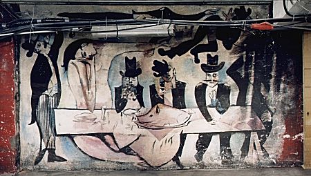 | Bekanntlich war am Pariser Platz beim Abriss der alten Keller der Akademie ein quasi vorgeschichtlicher Fund gemacht worden. Die Fundus-Gruppe, die einen Teil des bisherigen Grundstücks von der Akademie der Künste für ihren Erweiterungsbau am Hotel Adlon gekauft hatte, brauchte Baufreiheit für den Neubau. Und dabei fanden sich an den Kellermauern nahe der Heizung mehrere direkt auf die Wand gemalte Bilder von 1957 und 1958, darunter auch eines von mir: »Frühstück der Wilddiebe« ist ein Bild mit kräftigen Kontrasten. Entstanden ist es damals für unseren Akademie-Fasching. Eigentlich sind es zwei Bilder übereinander, denn das erste habe ich im darauf folgenden Jahr übermalt. Man könnte die Schichten, falls das geht, sogar wieder trennen. Es ist schon gut, dass das Bild samt Putzunterlage in die Fundus-Räume übertragen wird und also erhalten bleibt. In meiner Zeit der Wilddiebe, nämlich von 1955 bis 1958, hatte ich den täglichen Blick aufs Brandenburger Tor, ein damals alltägliches Gegenüber. Ich war Meisterschüler der Akademie, bin dort vor dem Tor aus der Tunnel-S-Bahn hochgekommen oder vom U-Bahnhof Thälmannplatz (heute Mohrenstraße) bis zum Pariser Platz gelaufen. Das Atelierhaus der Akademie war der letzte Rest des alten Gebäudes und diente jahrzehntelang als Atelier für die Akademiemitglieder und für die Meisterschüler. |