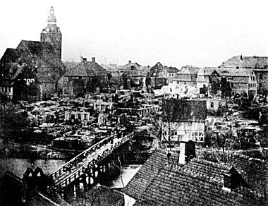 Gegen Mittag des 7. Februar war das Feuer so weit unter Kontrolle, dass es sich nicht mehr ausbreiten konnte. Allerdings war nicht zu verhindern, dass fast die Hälfte der Unterstadt bis auf die Grundmauern niederbrannte. Nur das Rathaus, die Kirche und die Apotheke konnten gerettet werden. Den angerichtete Schaden bezifferten Versicherungsgesellschaften mit 2,2 Millionen Goldmark. |