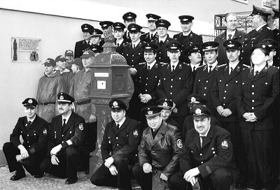 | Havelberger und Berliner Feuerwehrmänner (knieend) vor dem Feuermelder und der Erinnerungstafel |