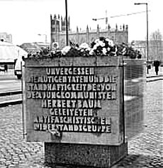 Am Rand des Lustgartens steht, dem Dom gegenüber, ein aus DDR-Zeiten stammender Gedenkstein mit dem Motto »Für immer in Freundschaft mit der Sowjetunion verbunden«. Der Würfel erinnert an den jüdischen Widerstandskämpfer Herbert Baum (1912-1942), nach dem in Weißensee eine auf den jüdischen Friedhof zulaufende Straße benannt ist, und seine Widerstandsgruppe. |