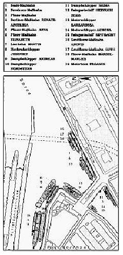 leerer Oderkahn und noch zwei kleine, unbeladene Fahrzeuge. Die Fahrtroute führt, ohne