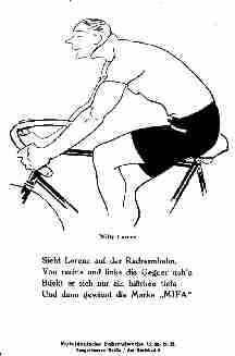 Da der Kronprinz den Wunsch aussprach, einen Fahrer hinter Motorradführung fahren zu sehen, fuhr Robl hinter Krüger einige Runden, nachdem die Sechstage-Fahrer abgestiegen waren.« Diese sicherlich willkommenen Pausen waren allerdings selten für die Fahrer. Von jedem Team mußte immer einer auf der Bahn sein; fielen Fahrer aus, wurden neue Zweier- Mannschaften zusammengestellt. Eine physische Tortur also, die auf die Akteure mit ihren relativ schweren Rädern wartete. Dazu aus dem Budzinski-Zeugnis Zitate von Walter Rütt (18831964), einem Radsportidol, Sieger zahlreicher Sechstage-Rennen (so in New York 1907, 1909 und 1912 oder in Berlin 1910, 1911 und 1912) über die Strapazen dieser sechs Tage: »Man verliert plötzlich seine gewohnte Lebensweise, hat keine Ruhe zum Essen und kommt nicht zum Schlafen. Man lebt eigentlich nur mit Hilfe des Managers, der einem das Essen in den Mund steckt, der einen wäscht, kämmt, umzieht, badet.« Gegen die Müdigkeit empfiehlt Rütt Tee oder Kaffee, »aber man soll dies solange als möglich hinausschieben, da | |||||||