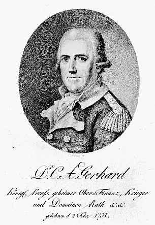 Gerhards Ernennung zum Geheimen Oberfinanzrat erfolgte 1786. Seit diesem Jahr war er zudem Mitglied der Finanzdeputation. Das gestattete ihm, sich auch mit übergreifenden Fragen zu beschäftigen (die Finanzdeputation erstattete im Rahmen der Gesetz- Kommission Gutachten über neue Gesetze). So empfahl Gerhard nach der Revolution in Frankreich die in Preußen überfällige Agrarreform, die Umwandlung von Domänen in Bauernhöfe. »Die Cultur der Acker und Wiesen« würde sehr zunehmen, »wenn ein fleißiger Bauer sein Eigentum ... allein besorgt ... der dienstpflichtige Unterthan arbeitet langsam, wenig und schlecht.« (»Abhandlung über die Verwandlung der Domainenämter in Bauerngüter«, 1790/91) Doch diese Vorschläge wurden erst nach dem Zusammenbruch Preußens mit den Stein- Hardenbergschen Reformen umgesetzt. In der schwersten Zeit Preußens während der französischen Besetzung wurde 1807 dem bereits 69 Jahre alten Gerhard die Leitung des Berg- und Hüttendepartements | |||||