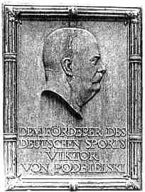 Seit wann der Baum den Namen »Podbielskieiche« trägt, geht aus der Literatur nicht ganz eindeutig hervor. Fest steht nur, daß aus Anlaß des 70. Geburtstages Viktor von Podbielskis im Februar 1914 an der Eiche eine von dem Berliner Bildhauer Walter Schmarje geschaffene Gedenktafel enthüllt wurde. Sie zeigt sein Profil und trägt die Inschrift: »Dem Förderer des deutschen Sports Viktor von Podbielski«. | |||