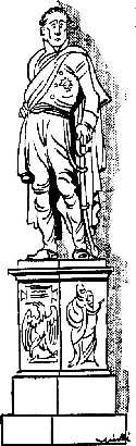 Wer das grün patinierte Blücherdenkmal betrachtet, sieht, wie der als antiker Held dargestellte Feldmarschall die Waffen empfängt beziehungsweise nach vollbrachtem Waffengang von Borussia, der Symbolfigur Scharnhorst: »Horch, da kommt wieder die scheene Musike!« |