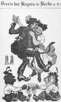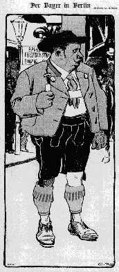 »Mit dem Aufstieg Preußens begann der Abstieg Bayerns. Auf beiden Seiten wurde ein Popanz aufgebaut, an dem wir mit unserer Ausstellung sägen wollen.« Vorurteile und Aversionen gab es überall, sichtbar etwa in zahllosen Karikaturen aus der Kaiserzeit, die die hochnäsigen »Preuß'n« den angeblich unterentwickelten Bayern gegenüberstellen. Pickelhaube und Weißwurst seien nun einmal unvereinbar, auch wenn in Berlin versucht werde, bayerisches Bier nachzuahmen, und die Preußen sich als Kulturbringer im Alpenland aufspielen. Bruno Paul läßt im Münchner »Simplizissimus« als »Bayern verkleidete« Berliner Sommerfrischler 1898 sagen: »Ich hatte nicht gedacht, daß man in den Straßen dieser Stadt doch so viele jebildet aussehende Leute treffen würde.« »Janz einfach zu erklären: drei Ferien-Sonderzüge aus Berlin heute anjekommen.« | ||