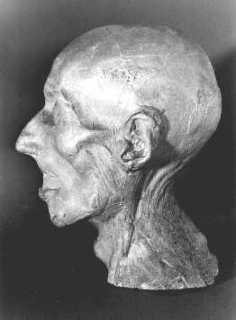 Bisher ist nur die damals »in tadellosem Erhaltungszustand« befindliche Kopfmaske im Königsberger Staatsarchiv in Clasens Werk abgebildet. Die dort gegebene Beschreibung gilt auch für die jetzt wiederentdeckte Maske in der Berliner Anatomie: »Durch die vollständige Abmagerung nur die Haut liegt noch auf den Knochen treten alle Einzelheiten des Schädels deutlich in Erscheinung. Die Nase steht schief. Ein einziger, vorstehender Zahn verschiebt den Mund nach rechts. Die mächtige Ausbildung des Hinterkopfes fällt besonders in der Profilansicht auf.« Immanuel Kant wäre wohl nur schwer mit einer die Spuren des Alters in solcher Direktheit zeigenden Büste einverstanden | ||