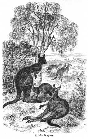 Riesenkänguruh (Halmaturus giganteus; Macropus gigant. M. major) fast eine kleine Heerde zu finden war, welche indessen schon zur Zeit der Uebersiedlung der Thiere nach dem hiesigen zoologischen Garten bis auf eine geringe Zahl zusammengeschmolzen war.«12)