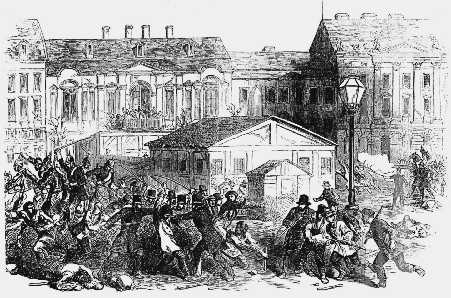 Tumult auf dem Dönhoffplatz, 27. April 1849. (Der Zeichner-Korrespondent der »Illustrated London News« dramatisiert jedoch: Kavallerie war nicht im Einsatz.) | |||