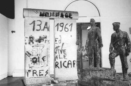 Mauerteile und Figurengruppe, bislang in der Eingangshalle, werden gemeinsam mit anderen Exponaten demontiert und ausgelagert | |||