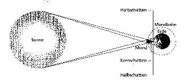 Die Entstehung einer totalen Sonnenfinsternis. Im Kernschattengebiet des Mondes wird eine vollständige (totale) Finsternis, im Halbschattengebiet eine teilweise (partielle) Finsternis beobachtet | |||