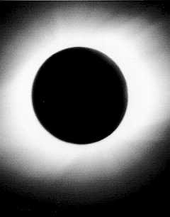 Total verfinsterte Sonne. Der Mond bedeckt genau die Sonnenscheibe, während die dünne gasförmige Sonnenkorona sich weit in den Raum hinaus erstreckt und im blassen Licht sichtbar wird