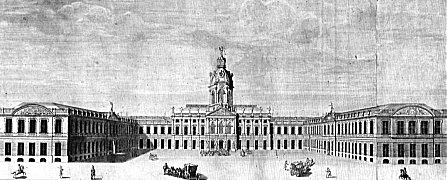 | Dieses erste Schloß Lietzenburg entsprach dem damaligen Anspruch eines nach allen Seiten frei in die Landschaft plazierten kleinen Lustschlosses. Es war zunächst nur eine Sommervilla ohne Wirtschafts- und Kavalierflügel. Diese Anlage hebt sich noch heute als überragender Mittelbau des Schlosses Charlottenburg deutlich hervor. Der zweigeschossige zentrale Mittelbau von elf Fensterachsen im Stil des italienischen Barocks wurde nach Plänen von Oberbaudirektor Johann Arnold Nering (16591695) zwischen 1695 und 1699 errichtet. Wenige Monate nach Baubeginn verstarb Nering, die Weiterführung wurde Martin Grünberg (16551707), Mitarbeiter bei Nehring und dessen Nachfolger als Hofbaumeister, übertragen. Er legte die Bauleitung im März 1699 nieder. Andreas Schlüter (16591714), seit 1698 Schloßbaudirektor, soll den weiteren Bau geleitet haben. Bis heute gibt es dazu in der Literatur keine gesicherten Angaben. Ein weiterer namhafter Baumeister, Johann Friedrich Eosander von Göthe (16691729), der 1699 in den Dienst des Kurfürsten getreten war und als Berater der Königin bei ihren Plänen zur Schloßerweiterung wirkte, hat das Baugeschehen maßgeblich beeinflußt. 1701 schickte ihn Friedrich I. nach Paris, um die damals als vorbildlich geltende Kultur des französischen Hofes zu studieren. Nach seiner Rückkehr wurde der alte Bau in eine langgestreckte Flügelanlage umgestaltet, das Hauptgebäude seitlich um 13 Achsen | ||