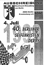 16. Juli 1949: Der Mehringdamm gehört erstmals den Seifenkisten Auf eine langjährige Tradition kann das Berliner Seifenkisten-Derby zurückblicken. Am 4. Juli 1999 unter der Schirmherrschaft des Bezirksamtes Kreuzberg und des ADAC Berlin zum 40. Male ausgetragen, ist es inzwischen nicht erst 40 Jahre, sondern sogar ein halbes Jahrhundert alt. Die Erklärung dafür ist einfach, hatte man doch mangels der für solche Veranstaltungen unentbehrlichen Sponsoren in der Zeit von 1972 bis 1981 eine Zwangspause einlegen müssen. Seitdem aber findet der populäre sportliche Wettkampf für Kinder und Jugendliche mit den lautweil benzinlosen Seifenkisten auf dem Mehringdamm wieder alljährlich statt.