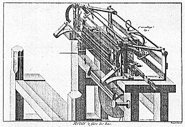 | Konstruktionszeichnung eines Strumpfwirkerstuhls, Kupferstich aus dem 18. Jahrhundert | |||||