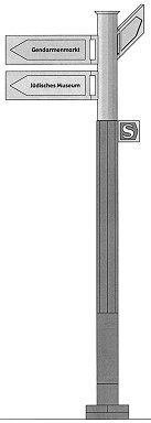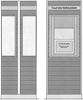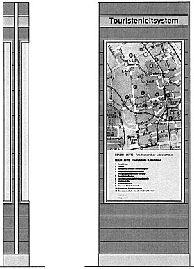 Das hier vorgestellte »Touristenleitsystem« wendet sich vor allem an die Neugierigen, die sich die Stadt per pedes erschließen wollen, also an die Mehrheit der Besucher Berlins. Es wird so eingerichtet, daß von Knotenpunkten des öffentlichen Personennahverkehrs, großen Parkplätzen und herausragenden Standorten und Sehenswürdigkeiten ausgehend die Stadt erschlossen wird. Die Orientierungshilfen erfolgen vor allem über »Übersichten«, »Wegweiser« und »Objekterläuterungen«. Die »Übersichten« geben in Form eines Stadtplanausschnittes und einer entsprechenden Legende eine Orientierung über eine Bedeutungsinsel in der Topographie der Stadt, die durch die wichtigsten Sehenswürdigkeiten in diesem Quartier konstituiert ist. Der »Wegweiser« dient als |