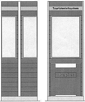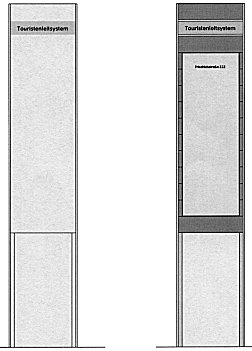 Zwei Aluminiumstrangpreßprofile bilden die Primärstruktur. Man kann nun entweder direkt ein emailliertes Paneel montieren oder eine allen Elementen des Touristenleitsystems