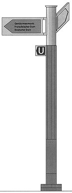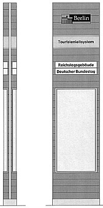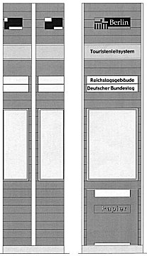 Aus der Geschichte und Topographie der Stadt ergeben sich einige Besonderheiten, die für das einzurichtende Touristenleitsystem zu berücksichtigen sind: Erstens besitzt Berlin zwischen Kurfürstendamm und Alexanderplatz ein sehr weitläufiges Zentrum, dessen Sehenswürdigkeiten sich nur mit Hilfe von »Bedeutungsinseln« in ein übersichtliches und touristenfreundliches Orientierungssystem einbinden lassen. Zweitens gibt es neben einzelnen herausragenden Sehenswürdigkeiten im großflächigen Berlin außerhalb des Zentrums eine Reihe von Konzentrationen touristischer Attraktionen, die für sich wiederum Bedeutungsinseln darstellen. Diese beiden Aspekte machen zwingend darauf aufmerksam, daß der Aufwand für die Einrichtung des hier vorgestellten »Touristenleitsystems« nicht gering ist und dieses daher nur schrittweise umgesetzt werden kann. Soll die Orientierung hilfreich sein, muß sie ein einheitliches Design besitzen. Da die Einrichtung des Systems mehrere Jahre in Anspruch nehmen wird, muß dieses eine ästhetische Qualität besitzen, die über Jahre hinaus Bestand hat. Vorliegendes Design steht zu dieser Herausforderung. Die Einrichtung des »Touristenleitsystems« sollte aus einsichtigen Gründen im Zentrum | ||